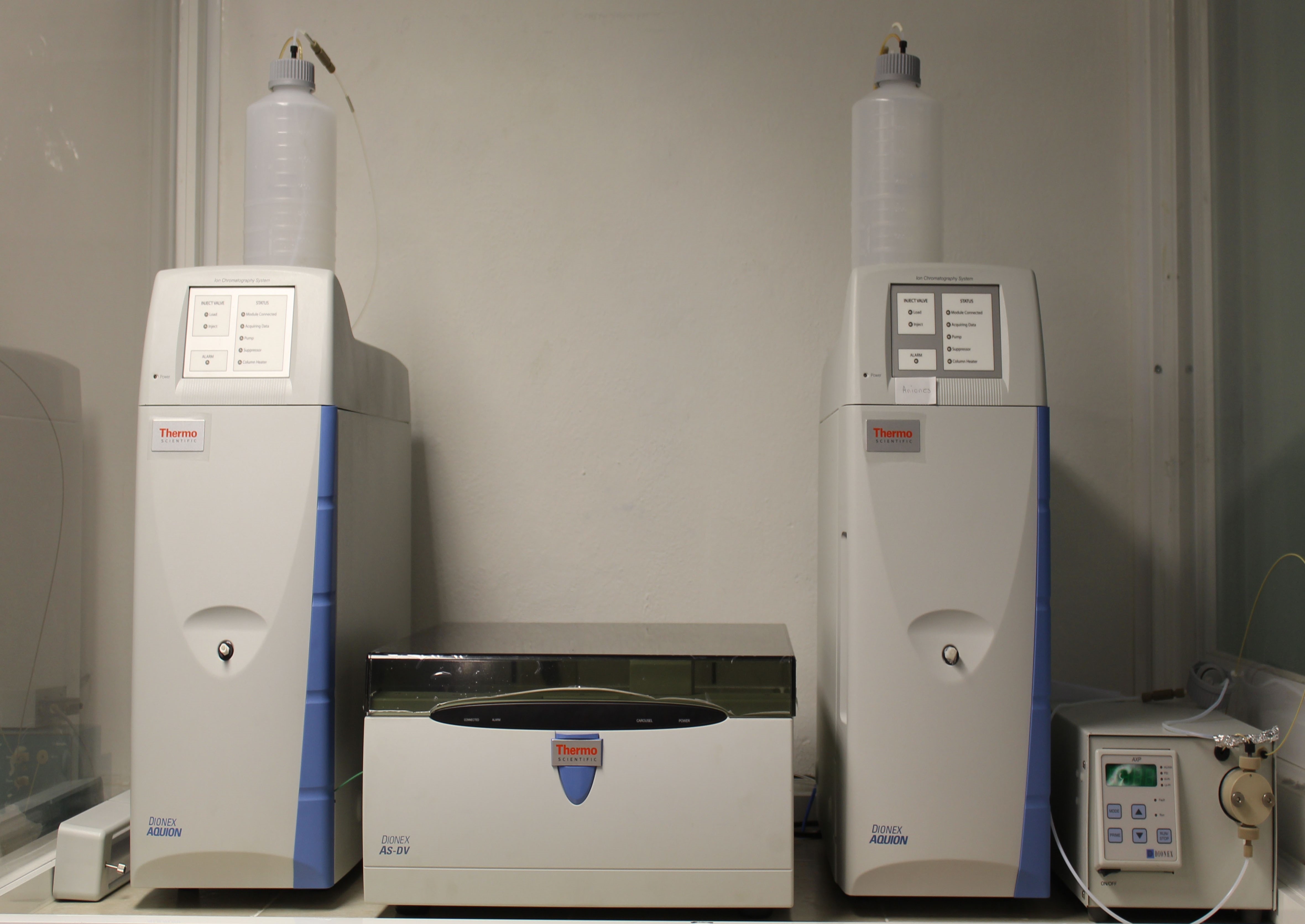 El objetivo principal de este laboratorio, es analizar la calidad del agua a través de cromatografía iónica, de diferentes tipos de agua, ya sea: superficial, intersticial o subterránea, tanto de ecosistemas de agua dulce, salobre y marinos. Esto con una alta precisión y reproducibilidad; para ello el laboratorio cuenta con dos cromatógrafos iónicos de alta precisión que miden la concentración de aniones y cationes, así como con un sistema de producción de agua tipo 1, balanza analítica, horno de convección, campana de extracción y congeladores para preservar las muestras. Asímismo, el laboratorio cuenta con un área especial para manejo de reactivos, preparación de curva de calibración y muestras.