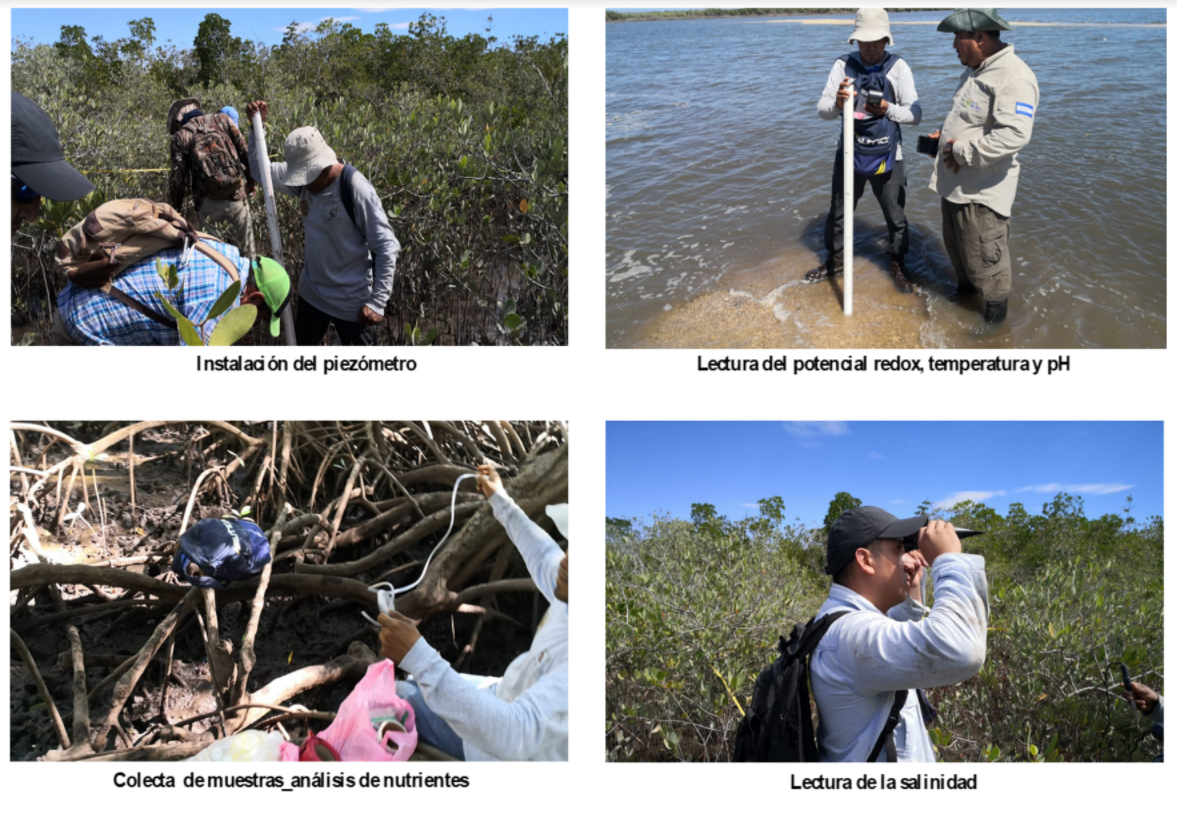 Fig. 2. Colecta de datos in situ de los parámetros fisicoquímicos del agua intersticial en bosques de mangle que bordean el Golfo de Fonseca en El Salvador, Honduras y Nicaragua.