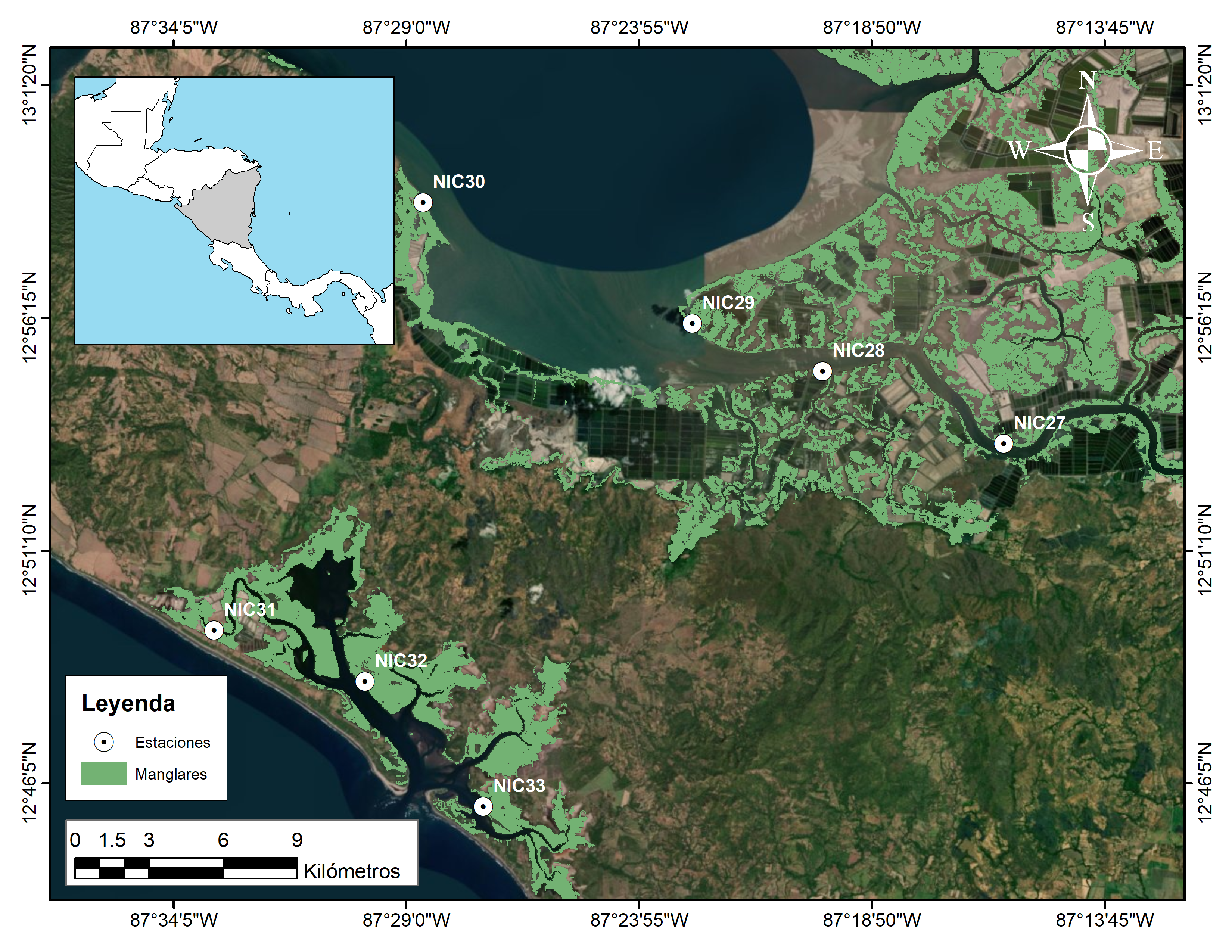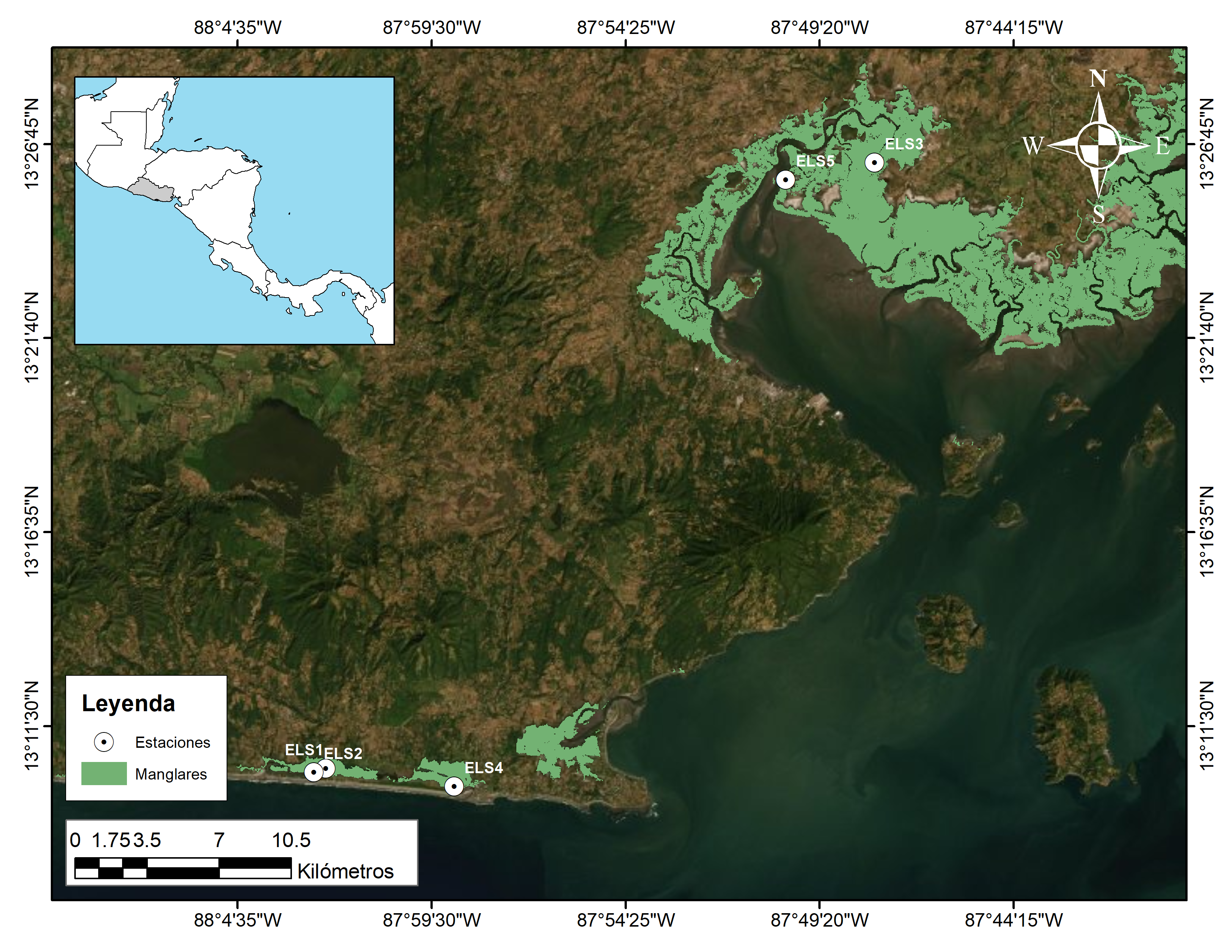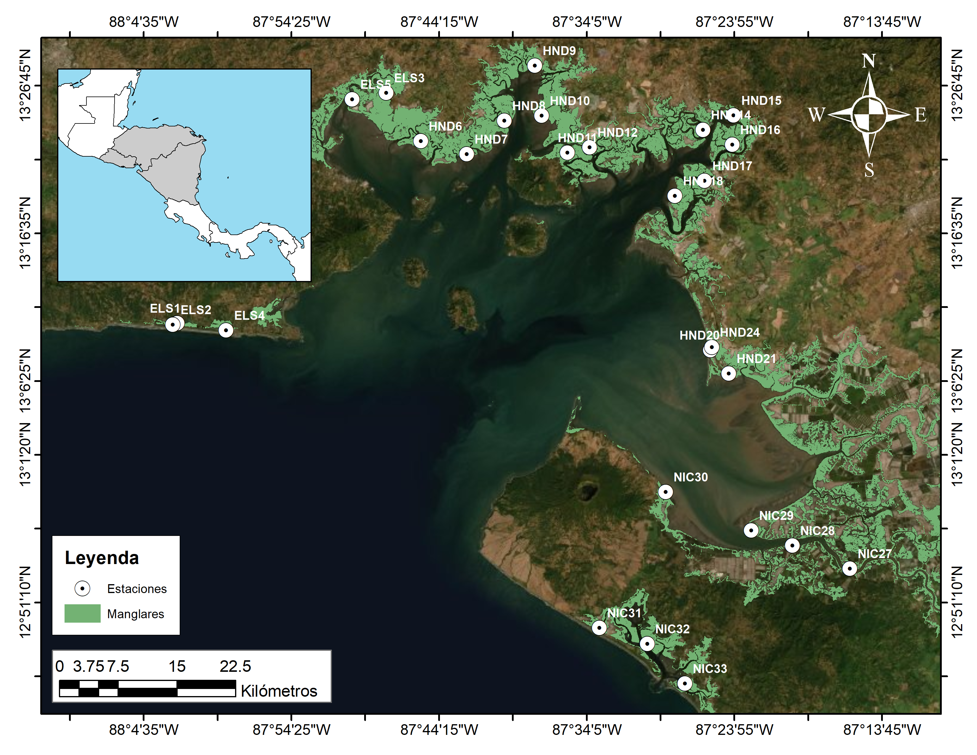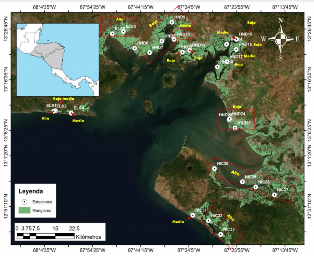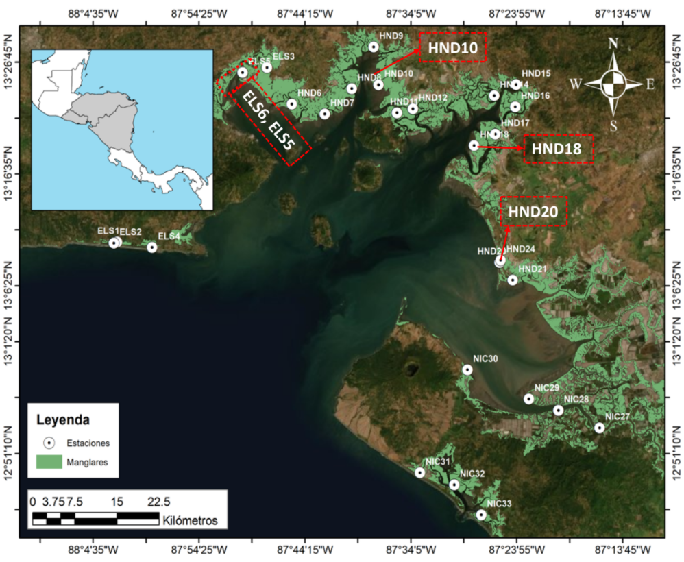 Fig. 1. Ecosistema de mangle que bordea el Golfo de Fonseca en Centroamérica y localización de estaciones de muestreo