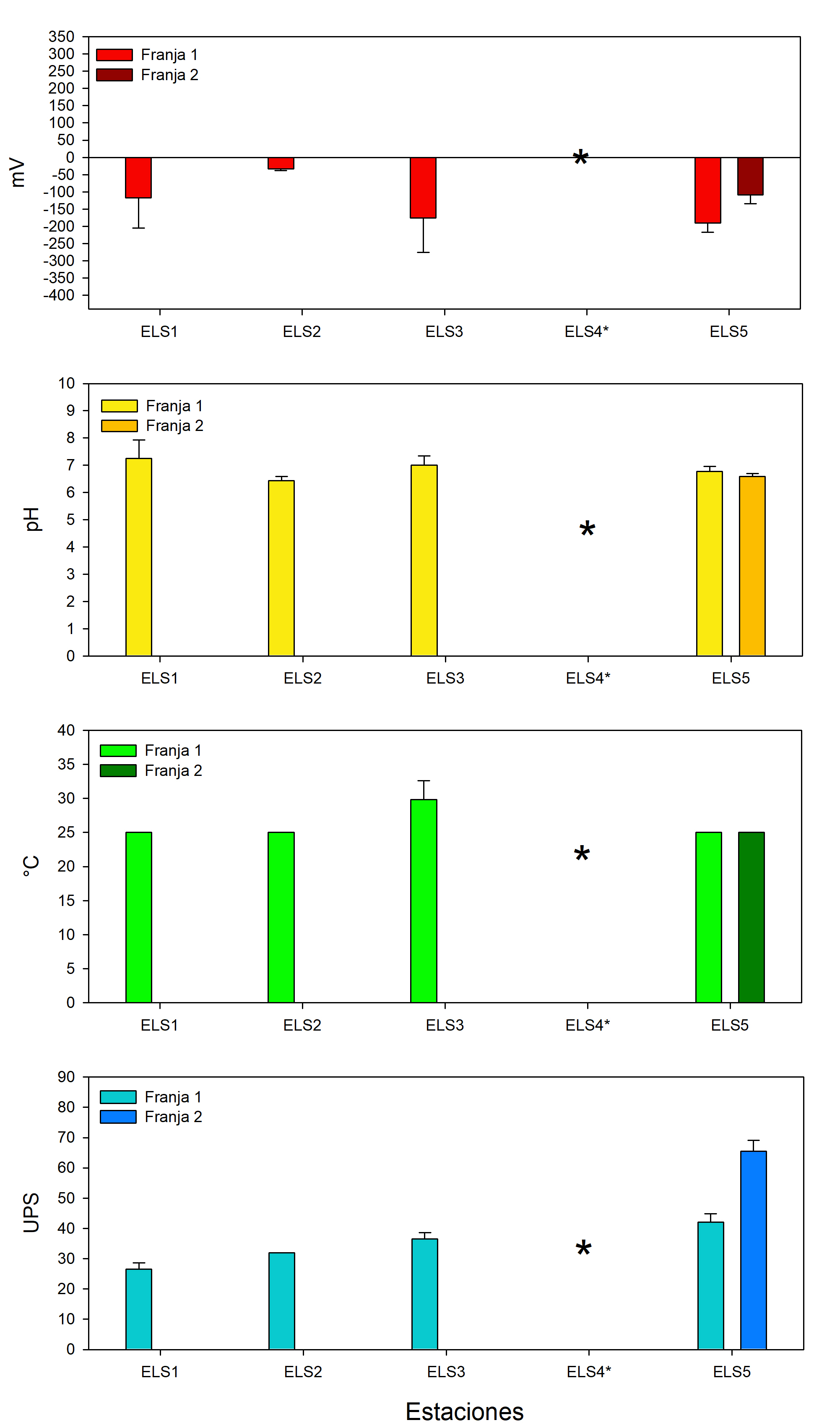 Fig. 6b. Parámetros físicos y químicos del agua intersticial, por estaciones en los bosques de mangle que bordean el Golfo de Fonseca en Honduras ubicados en el Golfo de Fonseca. *Piezómetro sin agua.