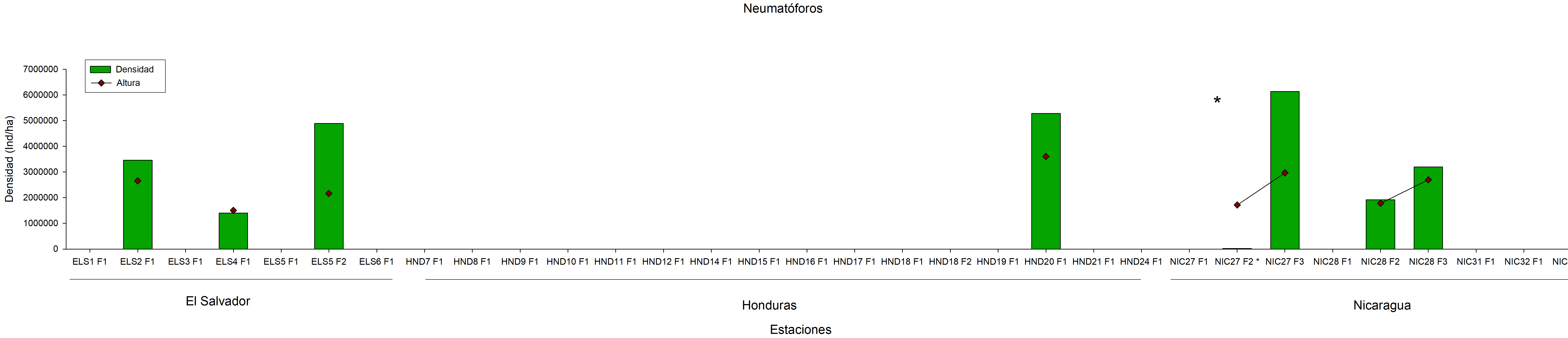 Fig. 13. Densidad y altura de plántulas en sotobosque en bosques que mangle que bordean el Golfo de Fonseca en El Salvador, Honduras y Nicaragua.