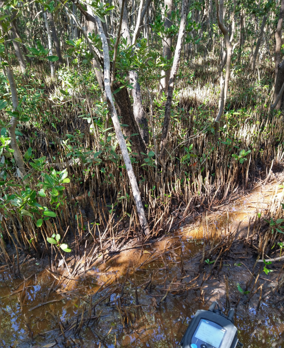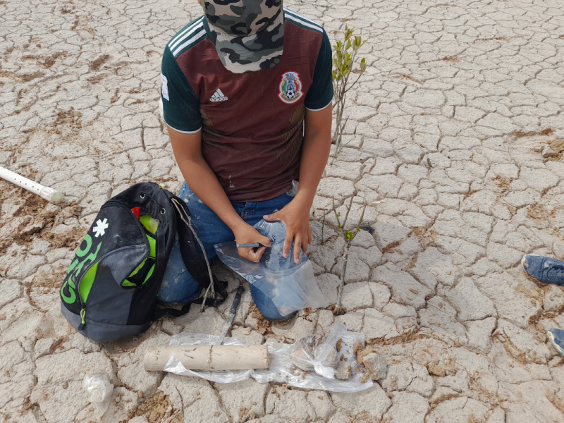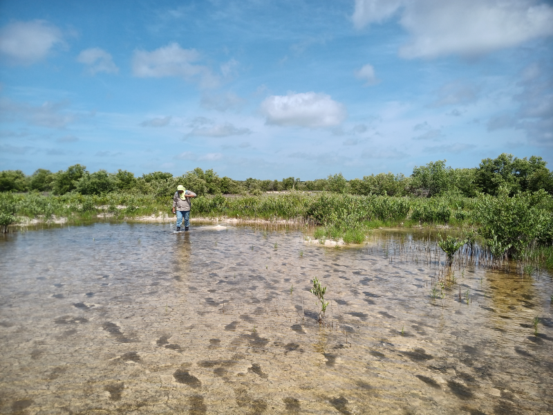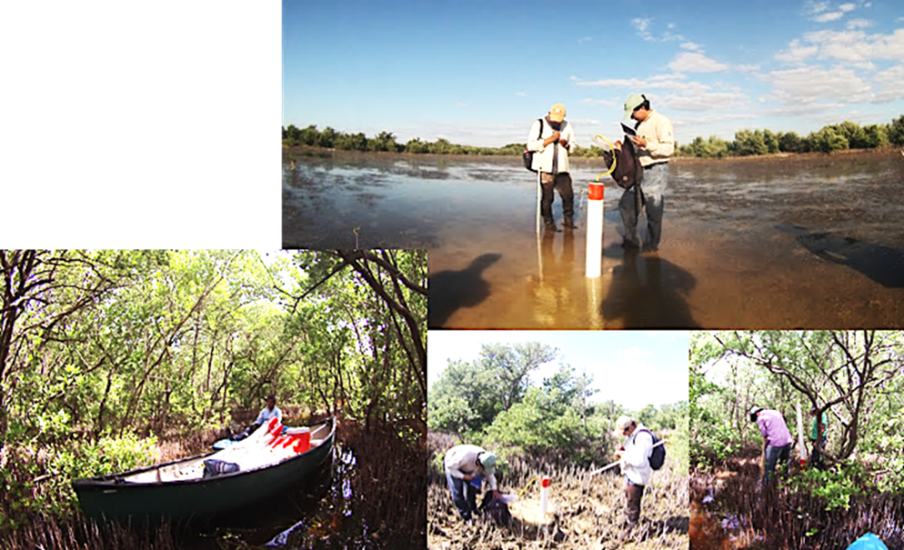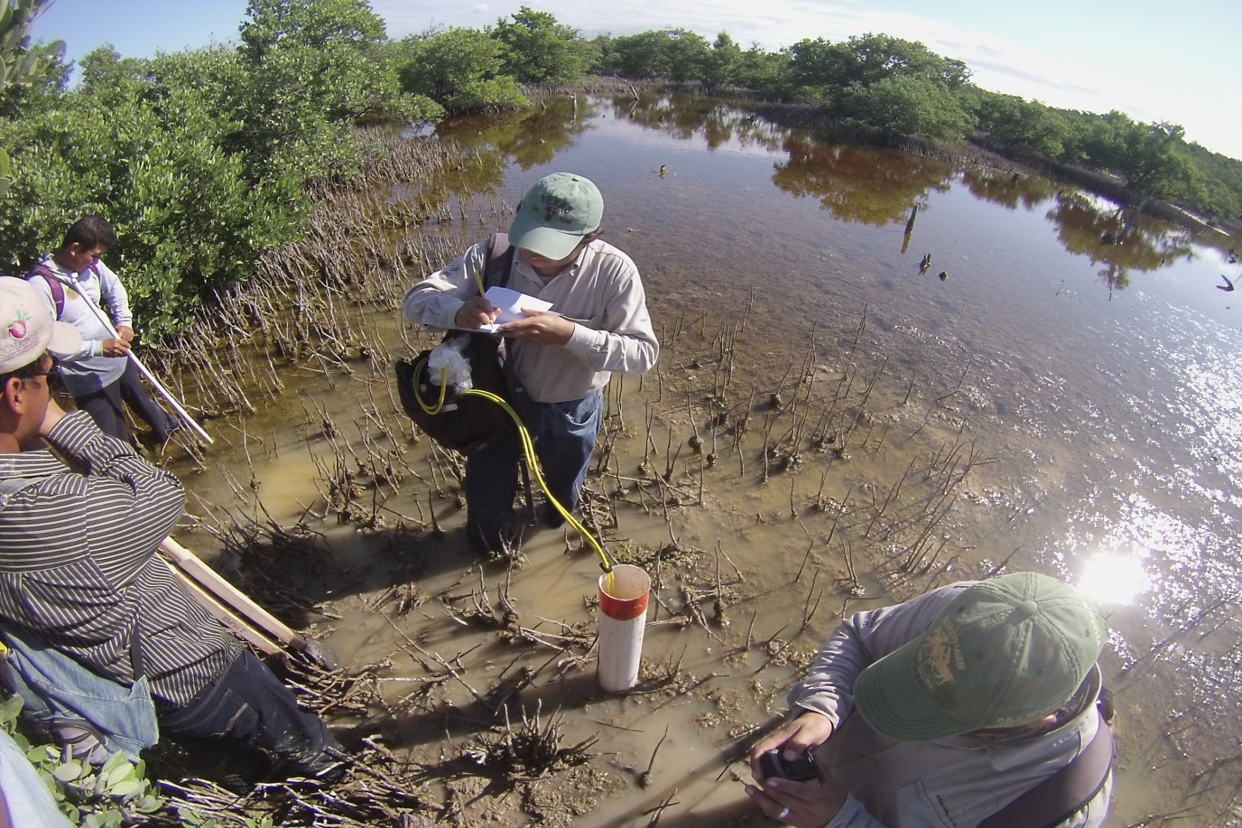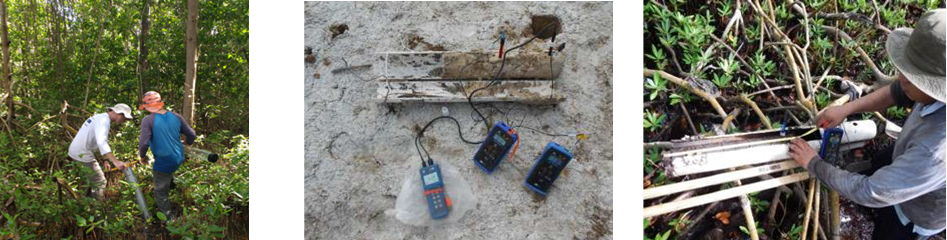 Fig. 1. Colectores de datos y muestras para la determinación de los valores y concentraciones de los parámetros fisicoquímicos del agua intersticial en el área de restauración al sureste de la Reserva de la Biosfera los Petenes, Campeche.