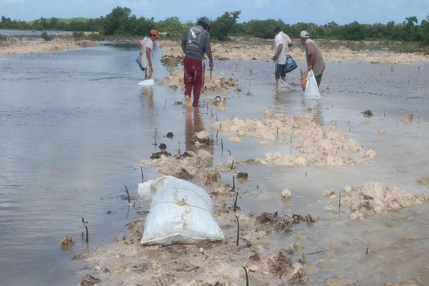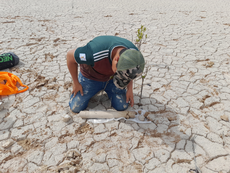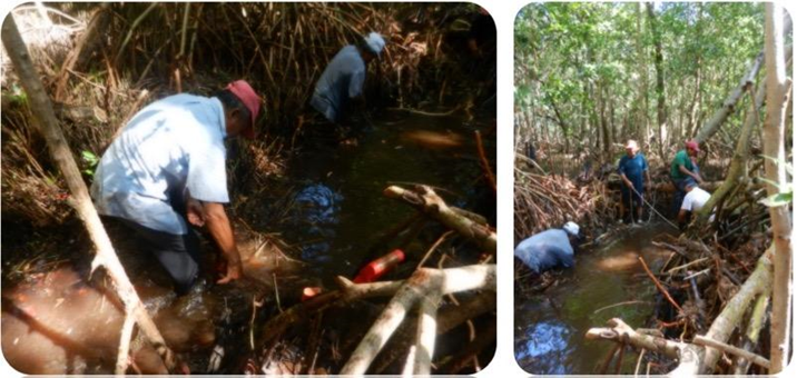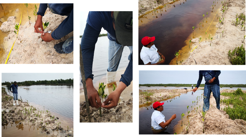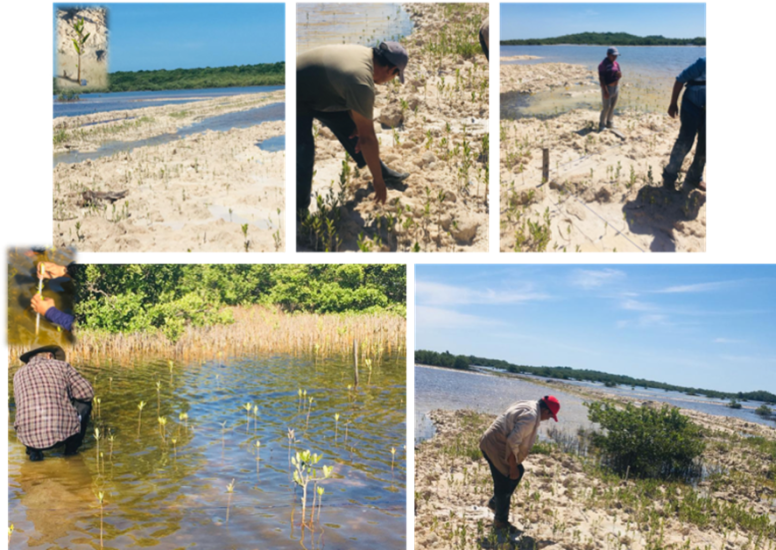Fig. 33. Recolección, siembra y voleo de hipocótilos y propágulos de R. mangle y A. germinans en las 517 ha a restaurar.