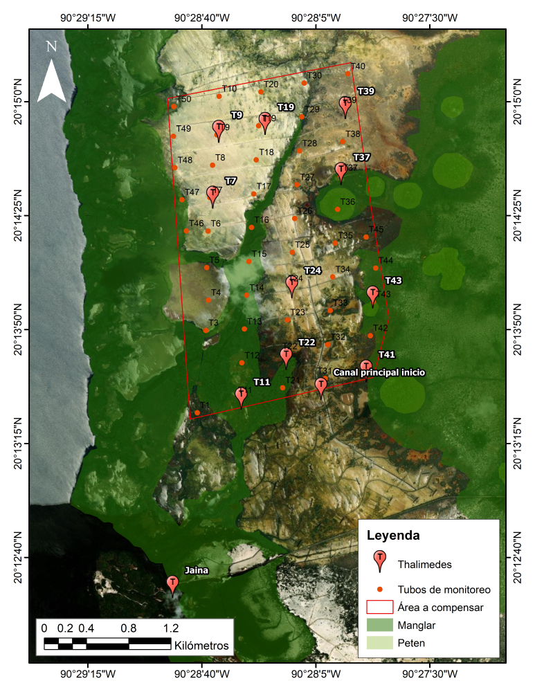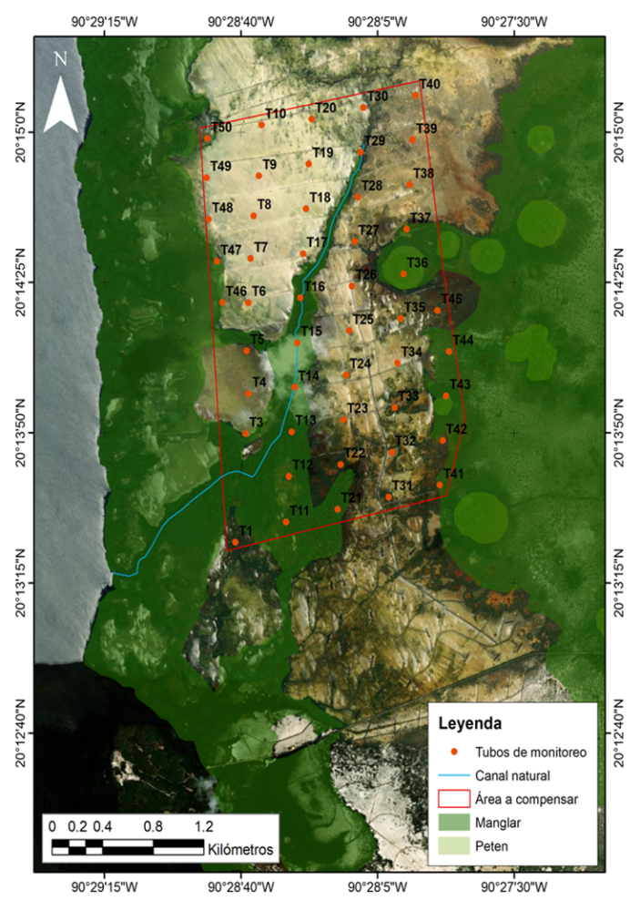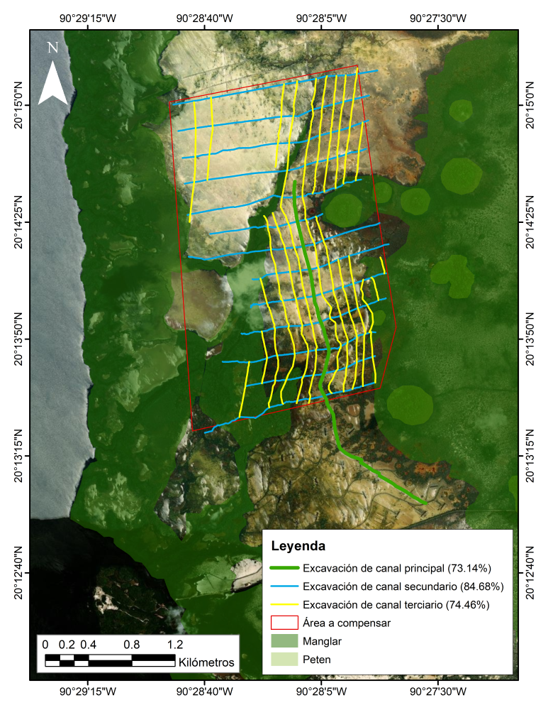 Fig. 26. Mapa de los avances de la rehabilitación hidrológica en 517 ha de mangle muerto en la Reserva de la Biosfera Los Petenes, Campeche.