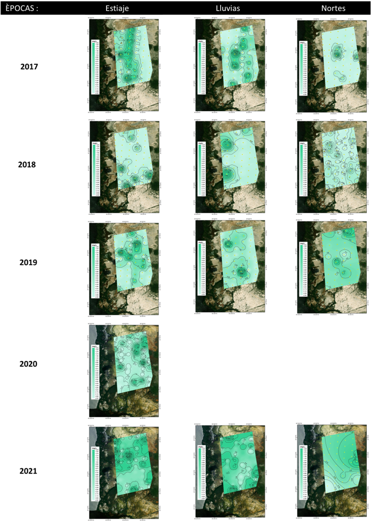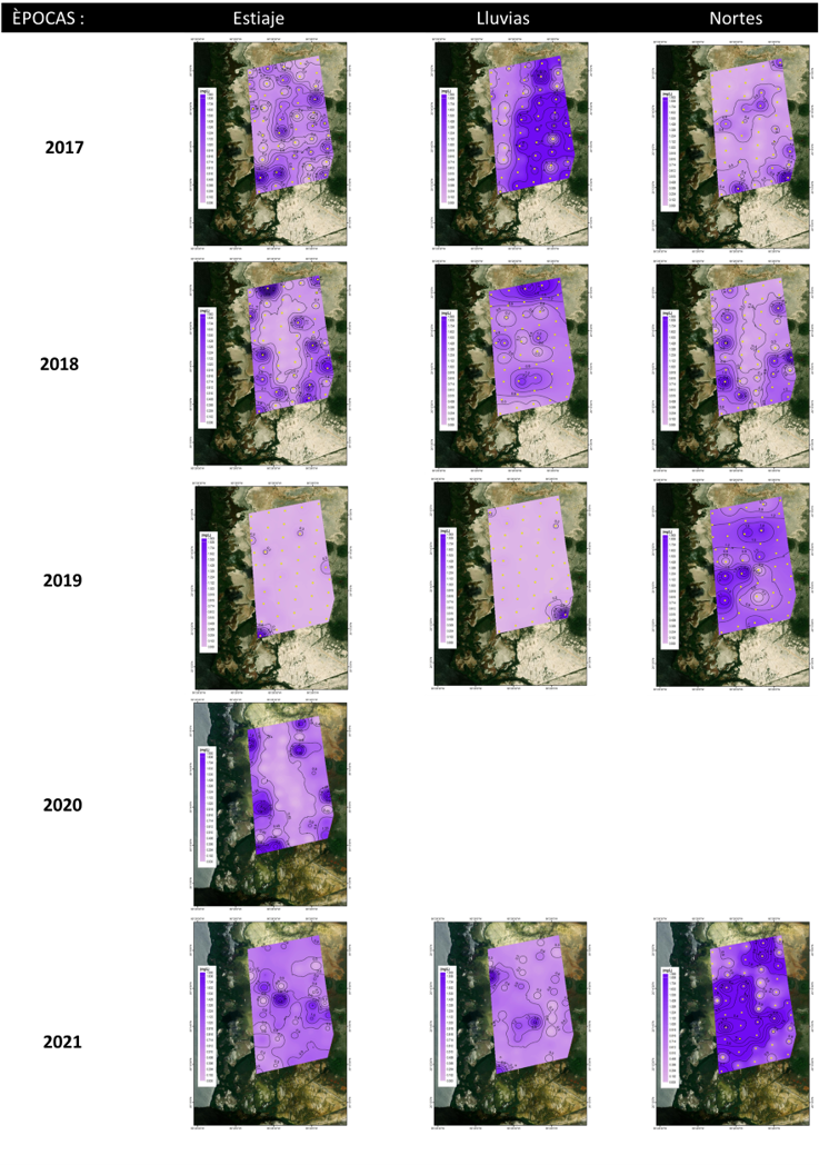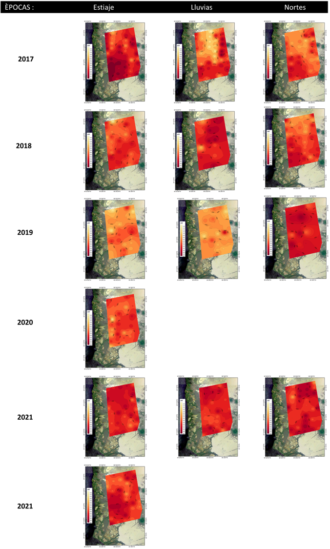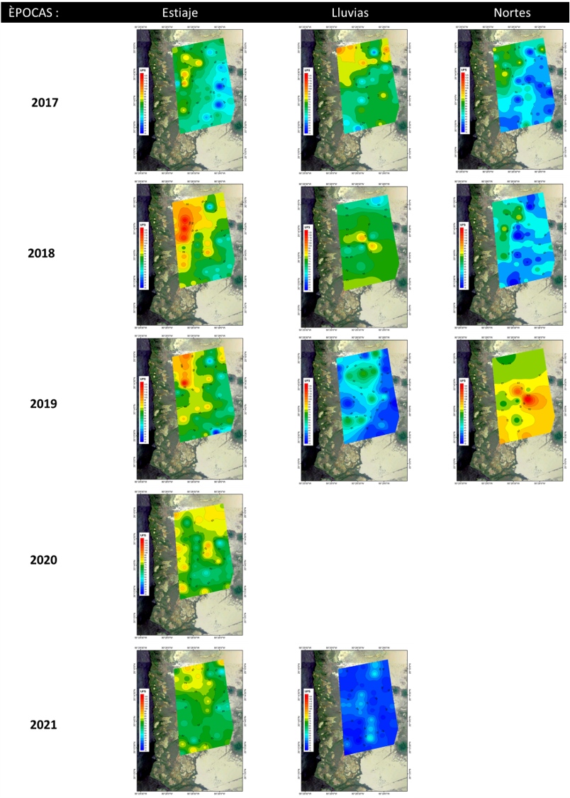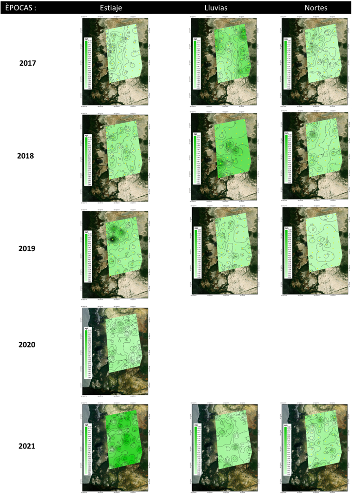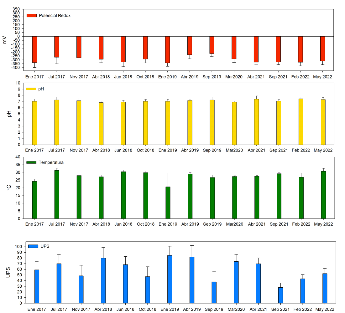 Para el caso de la zona sur en general las condiciones de salinidad del 2018 hasta octubre del 2021; fueron de (45.1±13.1 UPS), mayor grado de oxigenación (-266.0±49.5 mV) en el agua intersticial y condiciones ligeramente ácidas, comparado con el año 2017 (Fig. 10), al presentarse mayor cantidad de lluvias en el 2018.