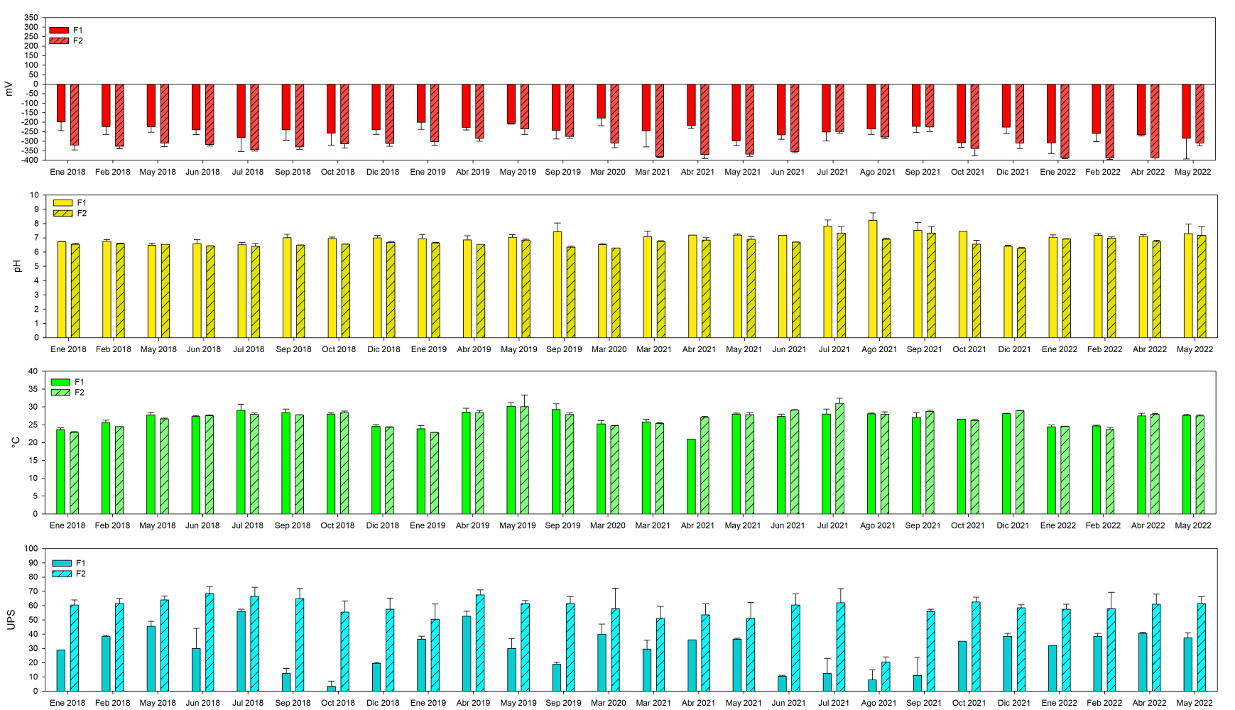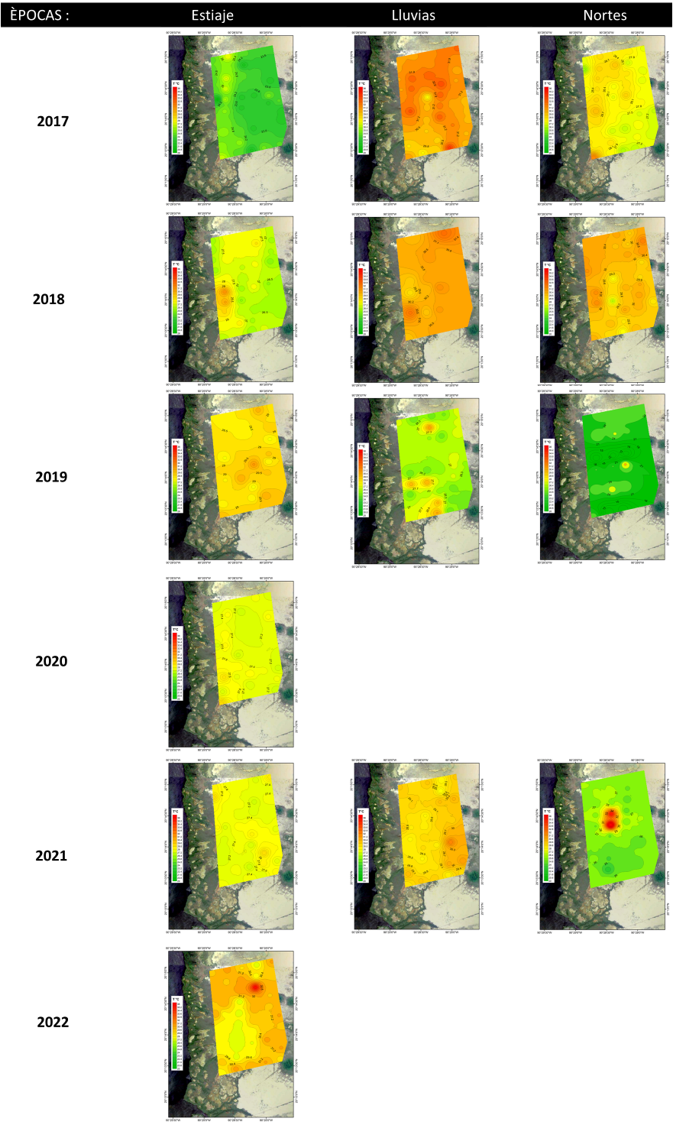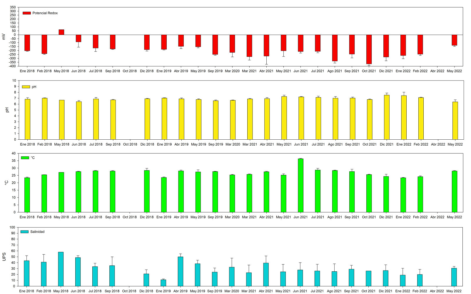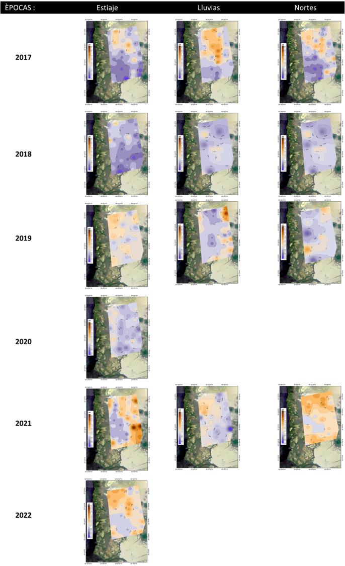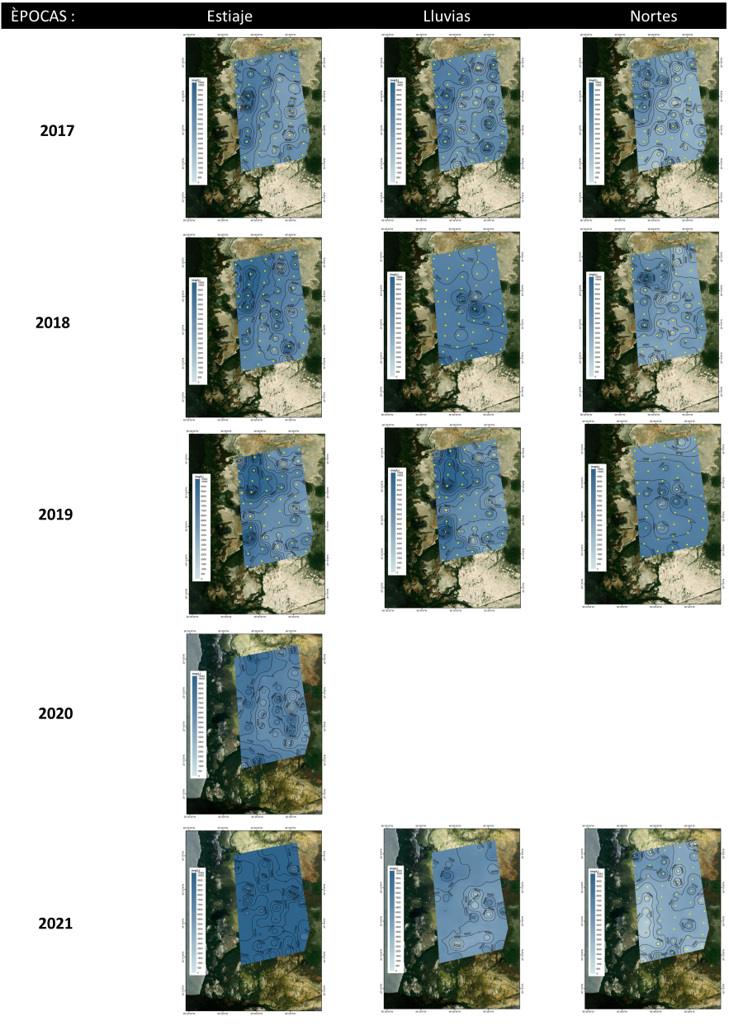 Para el caso de la zona sur en general las condiciones de salinidad del 2018 hasta octubre del 2021; fueron de (45.1±13.1 UPS), mayor grado de oxigenación (-266.0±49.5 mV) en el agua intersticial y condiciones ligeramente ácidas, comparado con el año 2017 (Fig. 10), al presentarse mayor cantidad de lluvias en el 2018.