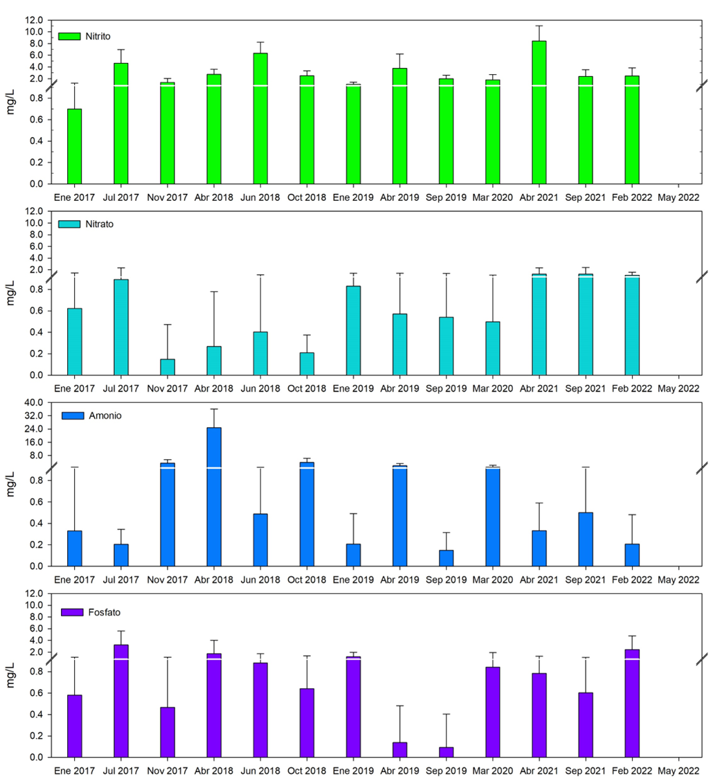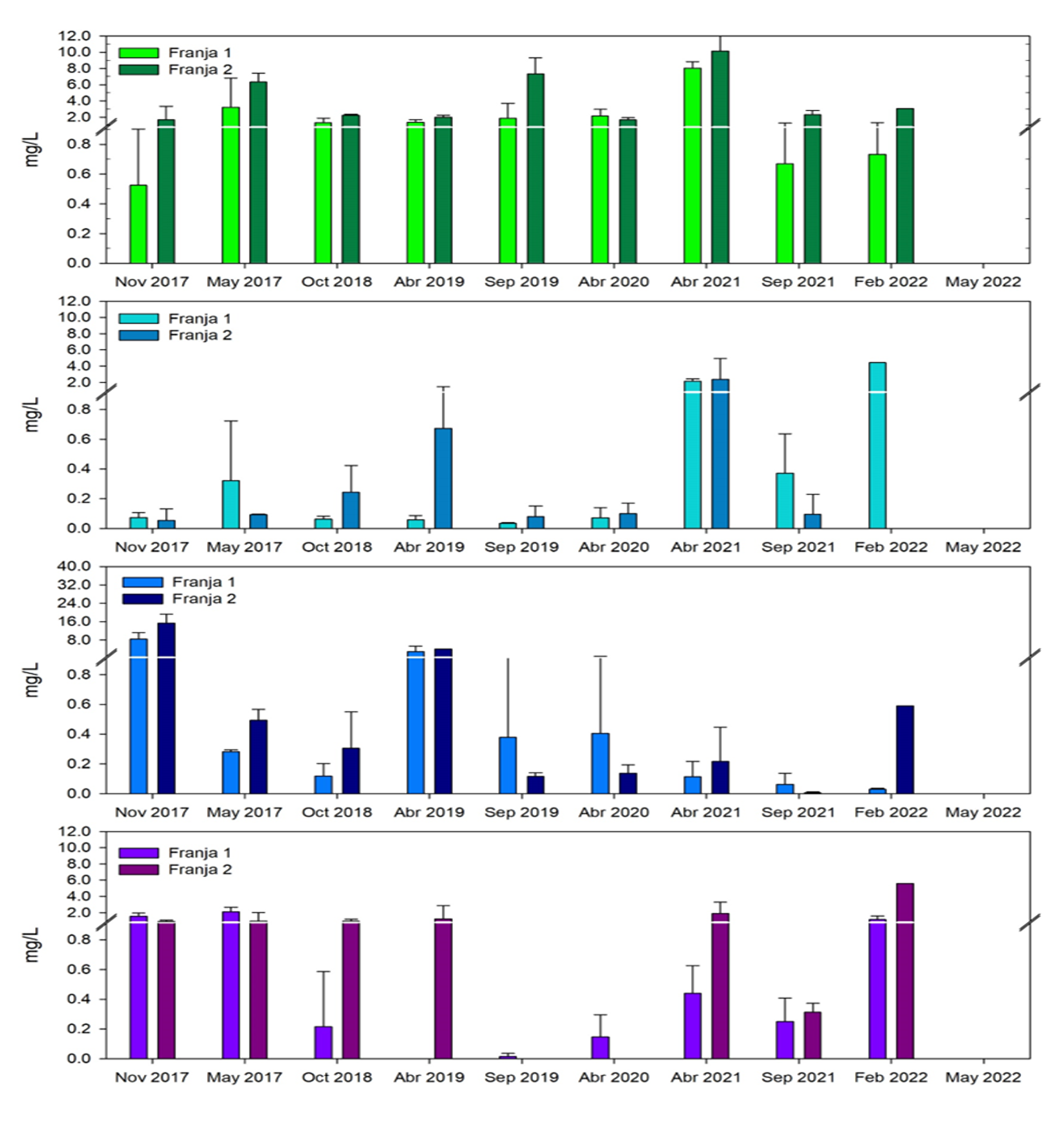 Fig. 13. Comportamiento de los nutrientes en el agua intersticial después de aplicar las acciones de rehabilitación hidrológica en un área de restauración de 517 ha, al sureste de la Reserva de la Biosfera los Petenes, Campeche