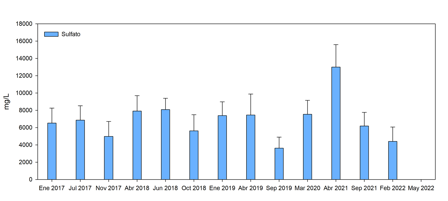 Fig. 14. Comportamiento de los sulfatos en el agua intersticial después de aplicar las acciones de rehabilitación hidrológica en un área de restauración de 517 ha, al sureste de la Reserva de la Biosfera los Petenes, Campeche