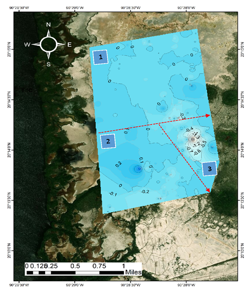 La distribución microtopográfica en las 517 ha establecen mínimos de -70 cm y máximos de 0 cm sobre el Nivel Medio del Mar (NMRM) (Fig. 22), con tres escenarios: 1) con 75% del área total, de -30 cm a 0 cm; 2) con 15% del área total, de -10 cm a 20 cm y 3) con 5% del área total, de-130 cm a 70 cm. Referido al NMRM. Estableciendo con ello subsidencia en el área de restauración, al comparar la distribución microtopográfica en el bosque de referencia (-35 a 37 cm referido al NMRM), justificándose con ello, la nivelación de suelo. Esto mediante el material extraído al excavar los canales artificiales, estableciendo con ello plataformas de reforestación. Donde se reforestaron por voleo A. germinans y siembra directa en el borde de los canales artificiales R. mangle. Acción que se expresa positiva para el 2019, con la sobrevivencia y el crecimiento de las plántulas de manglar.