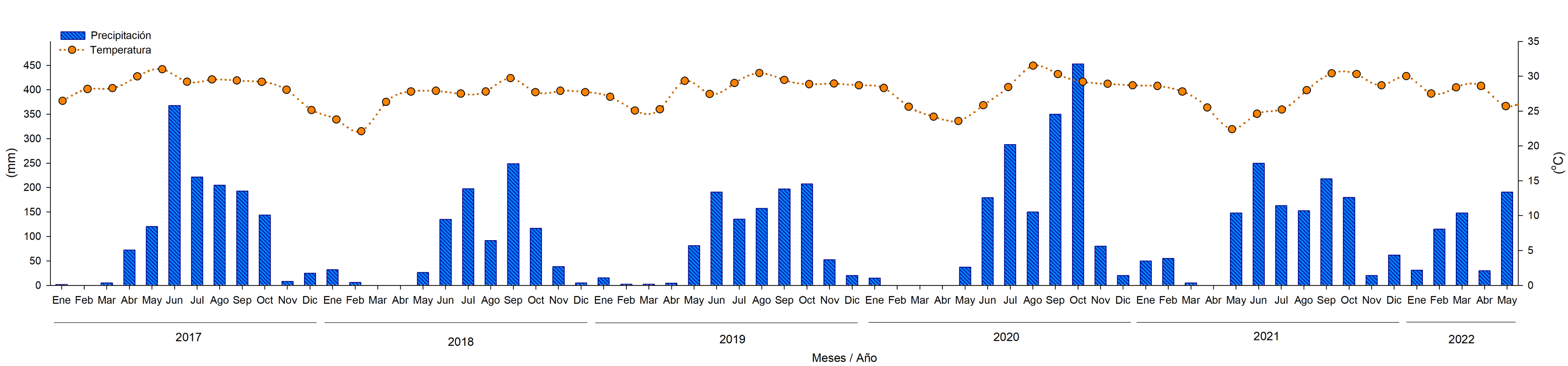 La precipitación mensual de enero de 2017 a mayo de 2022 de la estación meteorológica de Hecelchakán, Campeche (Clave: HECCA) (https://smn.conagua.gob.mx/es/climatologia/temperaturas-y-lluvias/resumenes-mensuales-de-temperaturas-y-lluvias), más cercana al área de restauración (Fig. 24). Esto con la finalidad de elaborar el climograma para identificar el tipo de clima, como este influye en las diferentes físicos y químicas del agua intersticial en el tiempo y su relación con la producción de hojarasca. Al comparar los periodos de enero a noviembre del 2018, con respectivo al año 2019, se establece 18.9% más de lluvia en el año 2019, sin embargo, se registra el desplazamiento del comportamiento de las lluvias (Fig. 26). Asimismo, se exhibió incremento en la precipitación, de 47.4% de enero a diciembre de 2020, comparando el mismo periodo en el año de 2019 (Fig. 26). Esto atribuido a los efectos del cambio climático que están incidiendo en los ambientes costeros principalmente en los patrones de temperatura y precipitación. Similares resultados fueron registrados por Agraz Hernández et al. (2017) y Chan Keb et al. (2018) en los manglares del Estado de Campeche, al establecer cambios atípicos interanuales en la precipitación y entre las épocas del año, durante el periodo del 2006 al 2009, como reflejo de la variabilidad climática a nivel global.