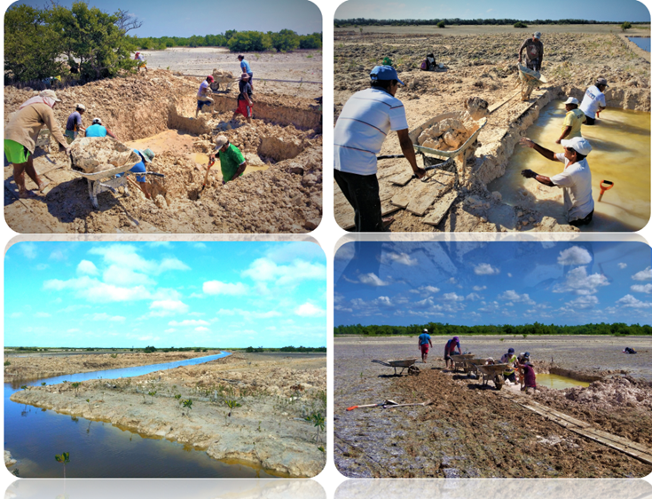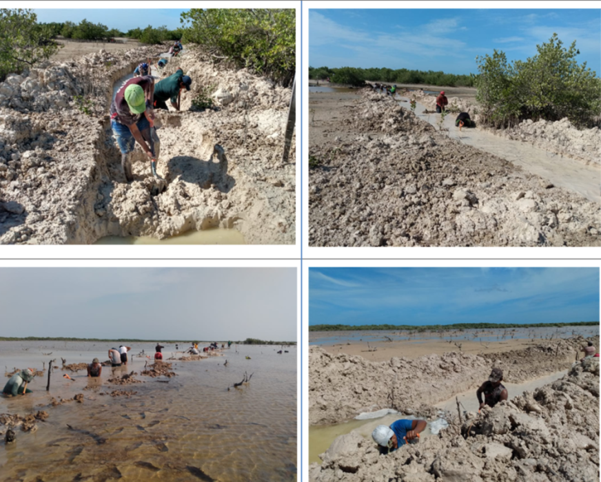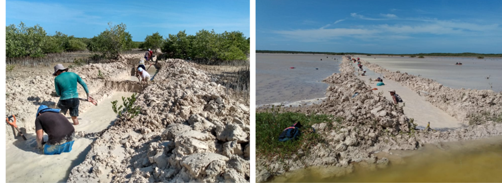 Fig. 31. Excavación de canales artificiales en el 2021 en un sitio con acciones de restauración, ubicado en la Reserva de la Biosfera los Petenes, Campeche.