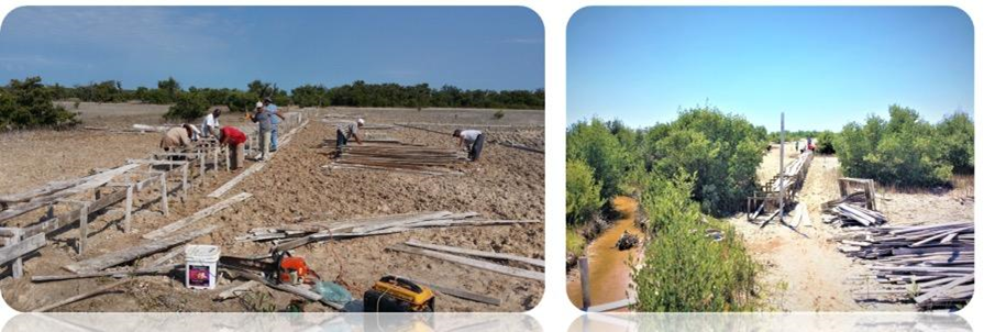 Fig. 30. Excavación de canales artificiales (izquierda) en el 2018 y funcionamiento de los canales artificiales realizados en el año 2017 (derecha) en un sitio con acciones de restauración, ubicado en la Reserva de la Biosfera los Petenes, Campeche.