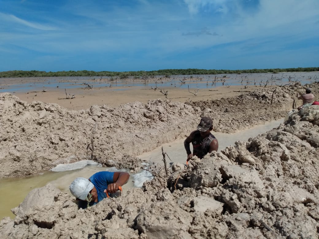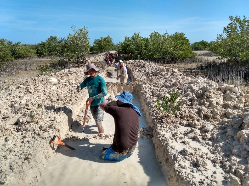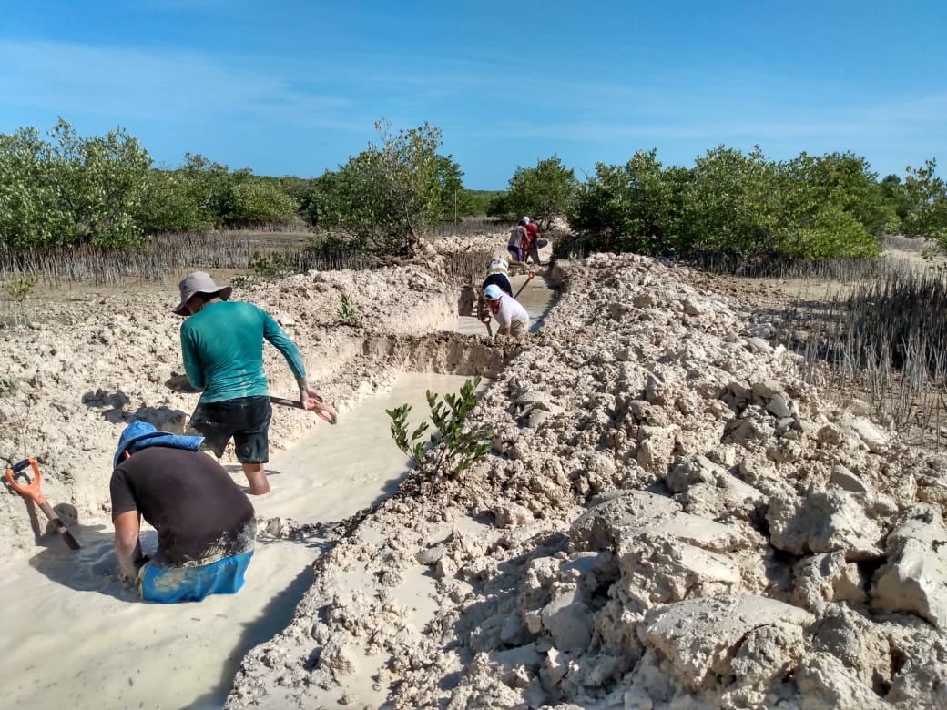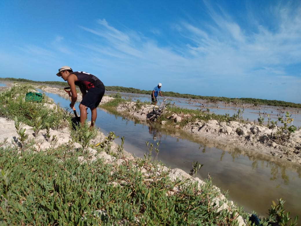 Fig. 32. Excavación de canales artificiales en el 2021 en un sitio con acciones de restauración, ubicado en la Reserva de la Biosfera los Petenes, Campeche.