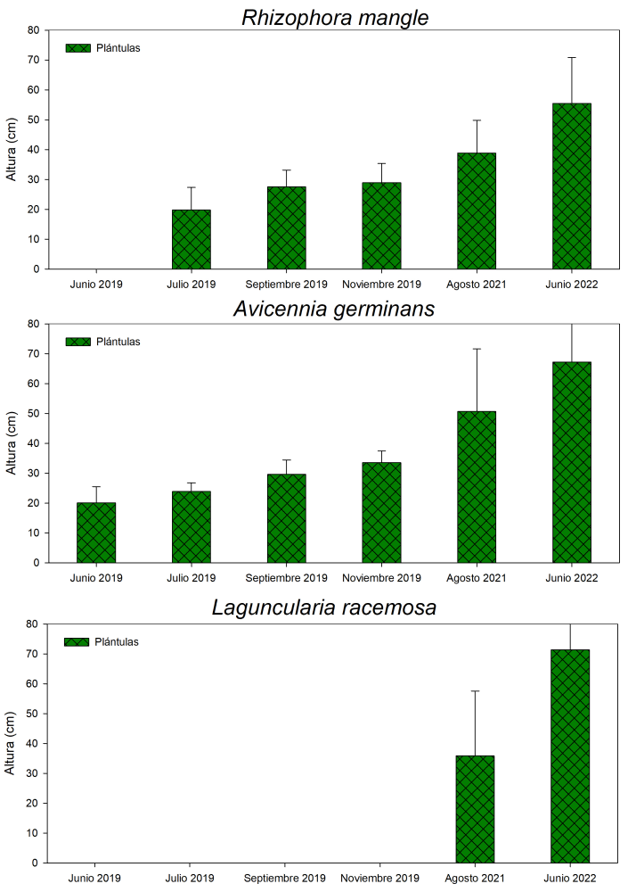 Con respecto a las tasas de crecimiento las plántulas de A. germinans fue de 0.06 ± 0.03 día-1, con alturas máximas de 50.7 ± 20.9 cm (Fig. 37). En el caso de R.mangle exhibió tasas de 0.07±0.09 día-1 y alturas de 40.0±12.9 cm (Fig. 37), respectivamente. Asimismo, se presenta alta regeneración natural en toda las 517 ha, sin posibilidad de cálculo por la alta densidad y sobrevivencia. Incluyendo la regeneración de Laguncularia racemosa, registrándose alturas, razón por la cual, se espera que la vegetación cubra gran parte del área de restauración al término de las acciones de restauración y reforestación.