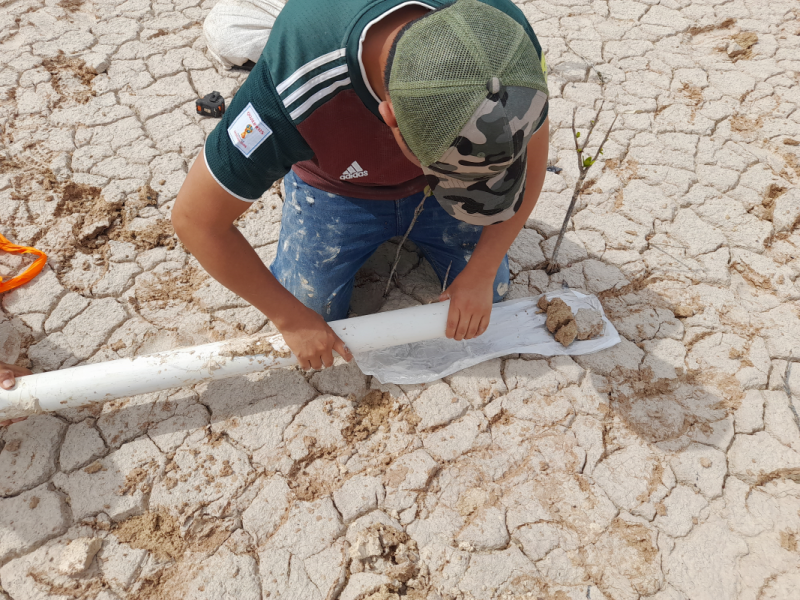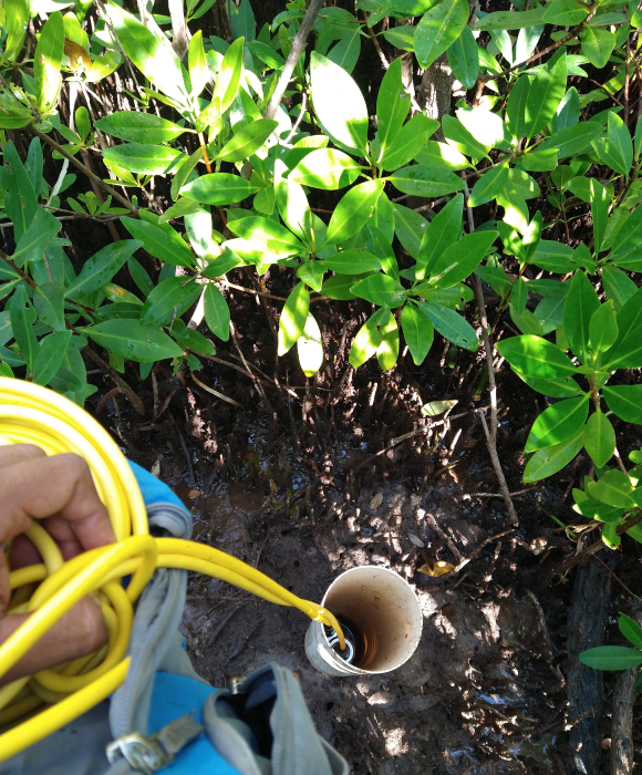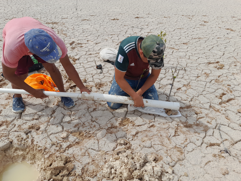 Instalación del material y equipo: una vez seleccionados los bosques de referencias, durante el mes de enero del 2017 se instalaron 3 colectores de agua intersticial en la zona de referencia, a una profundidad de 60 cm. Así como, 50 colectores distribuidos en las 517 ha de manglar a restaurar (Fig. 1 y 2). Esto con el fin de caracterizar y llevar a cabo el monitoreo de la salinidad, temperatura, potencial redox y nutrientes del agua intersticial; antes, durante y posterior a la restauración. Durante la instalación cada colector fue etiquetado, georreferenciado y tapado para evitar obstrucción (Fig. 2).