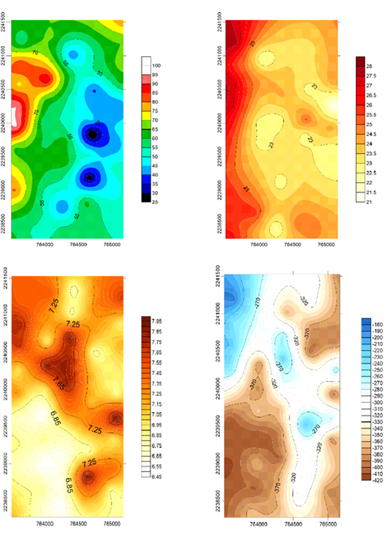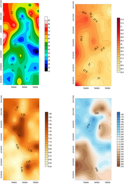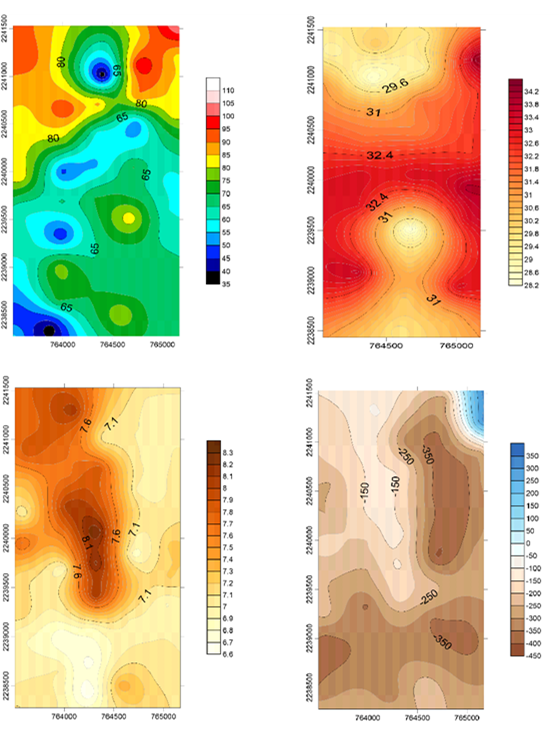 Fig. 8. Comportamiento de los parámetros fisicoquímicos del agua intersticial en 517 ha de mangle muerto en la Reserva de la Biosfera Los Petenes, Campeche, durante el tiempo 2 (noviembre, 2017). (a) Salinidad; (b) Temperatura; (c) pH; (d) Potencial redox.