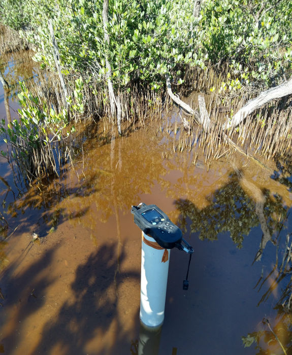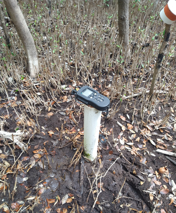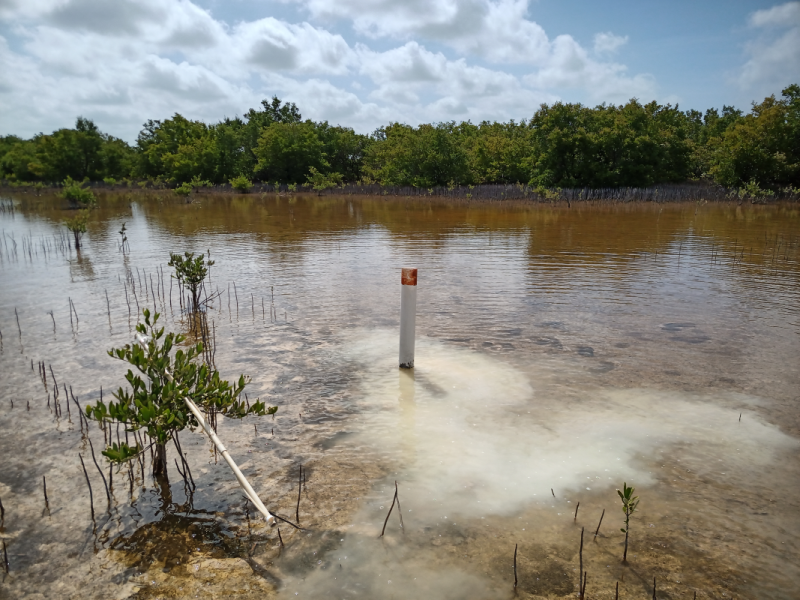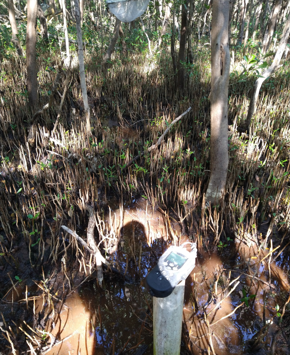 Fig. 23. Instalación de los Datalogger para registrar el comportamiento del hidroperíodo en una zona con procesos de rehabilitación hidrológica adyacente la Isla de Jaina, en la Reserva de la Biosfera Los Petenes, Campeche.