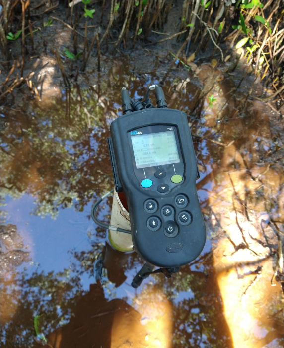 Condiciones fisicoquímicas del agua intersticial: una vez instalado los colectores del agua intersticial durante los meses de enero-febrero del 2017, se inició con el monitoreo cada cuatro meses de los parámetros fisicoquímicos la zona de referencia; y en los 50 colectores que se distribuyen en el polígono de restauración (517 ha de mangle muerto) y 3 instalados en las referencias. Para la colecta de datos in situ, se drenó cada colector para eliminar el agua estancada, dando un tiempo de estabilización de 10 minutos. Posteriormente, se midió el valor del potencial redox, temperatura y pH del agua intersticial, mediante un equipo multiparamétrico marca Hach modelo HQ11d; y en el caso de la salinidad, esta fue determinada a través de un refractómetro modelo ATAGO 0-100%0. Finalmente, se colectaron dos muestras de agua en frascos de 50 ml (pre-lavado con HCl- al 5%) mediante una bomba de gravedad para el análisis de los nutrientes .