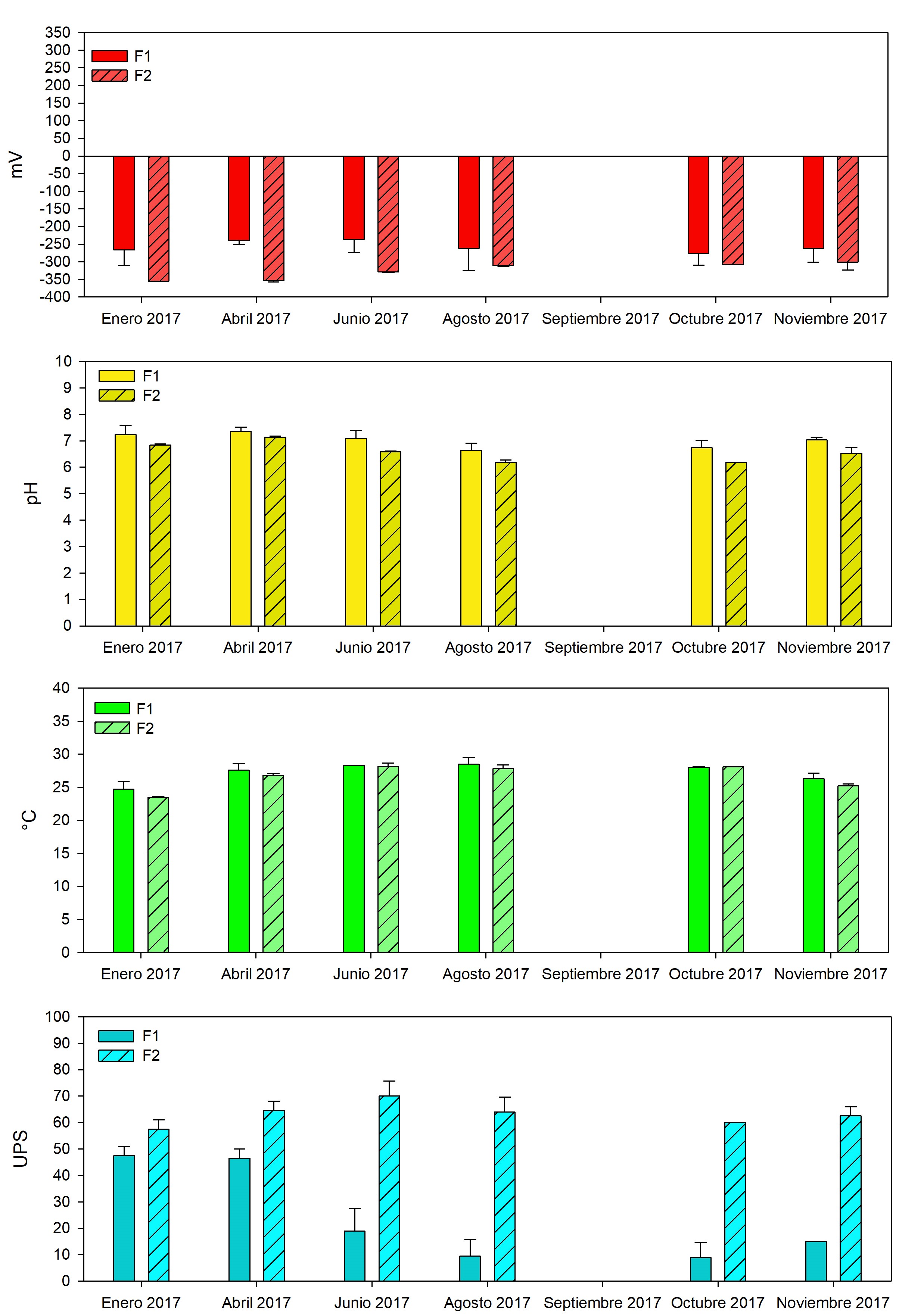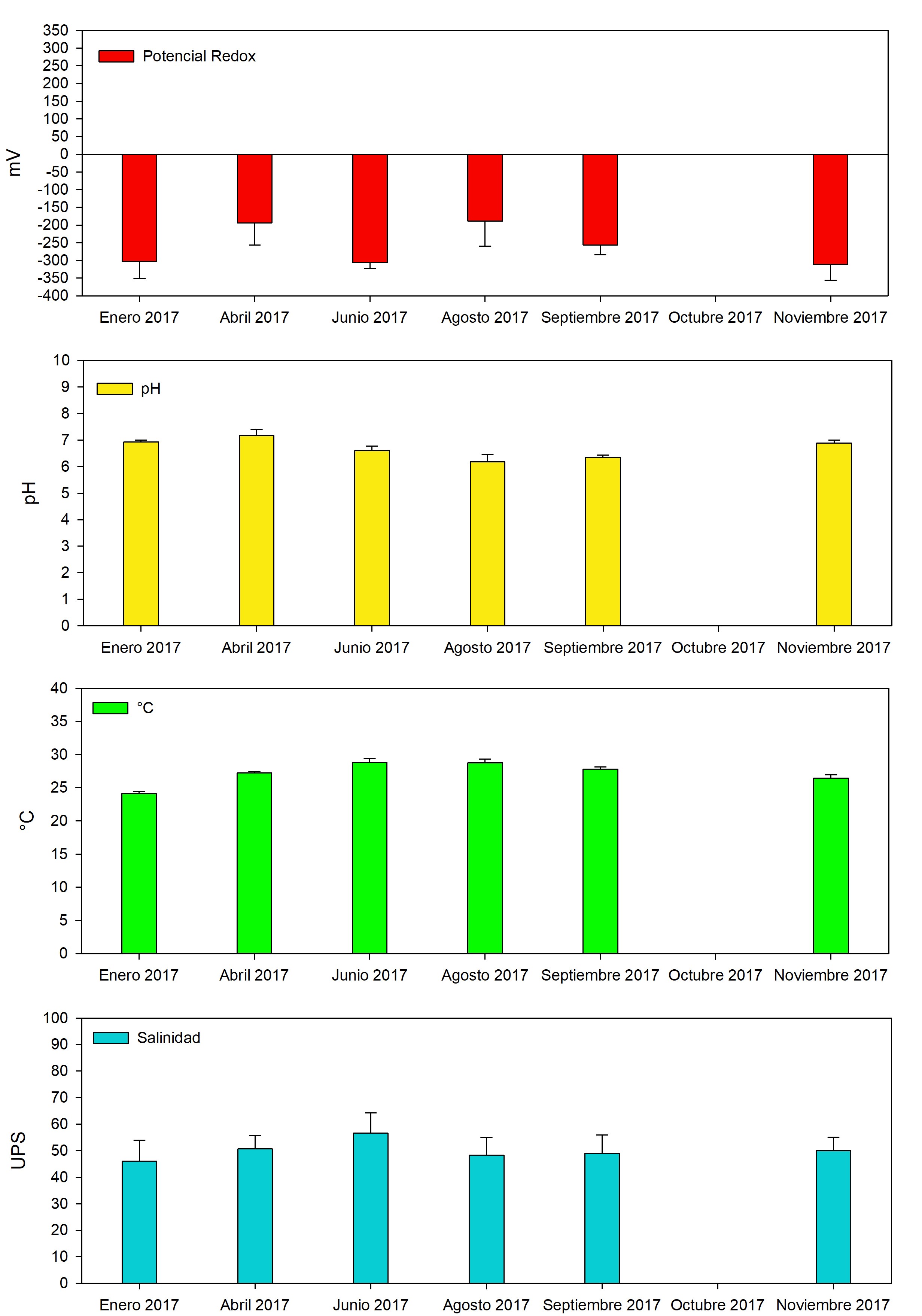 Se estableció en el mes de abril del 2017 el monitoreo mensual de los parámetros fisicoquímicos del bosque de referencia en estudio; cabe destacar que, durante los meses de mayo y octubre derivado de la dificultad de acceder a los manglares de referencia, no fue posible la toma de datos in situ.