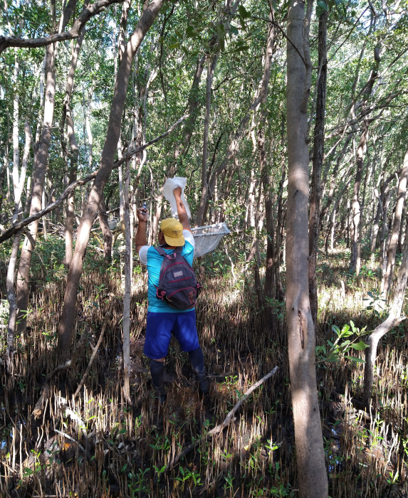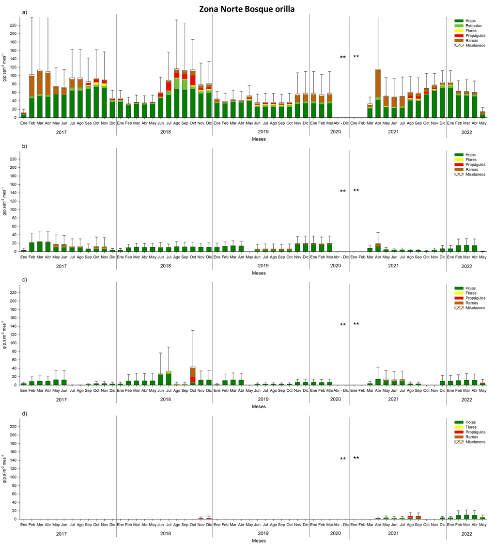 Se establecieron canastas de defoliación (0.5 x 0.5 m) en los bosques de referencia, con la finalidad de estimar la producción de hojarasca (materia orgánica aportada por los bosques de mangle en el área). Para conocer la fenología de las especies de mangle dominantes y capacidad de colecta de los propágulos en el mes de menor estrés por las condiciones ambientales (de mejor calidad y viabilidad), sin alterar la regeneración del bosque. Cabe destacar que en los meses de mayo y julio del 2017 no fue posible colectar la hojarasca, pues no hubo acceso al área, sin embargo, la producción de hojarasca fue obtenida al estandarizar los datos a través del promedio diario, el número de días transcurridos y los días que corresponde de cada mes. Es importante mencionar que los resultados en la producción de hojarasca y comportamiento fenológico fueron de enero 2018 a noviembre del 2021; derivado de la pandemia COVID fue imposible colectar de abril 2020 a febrero del 2021.