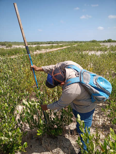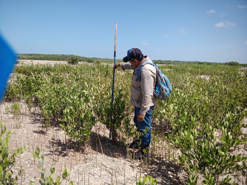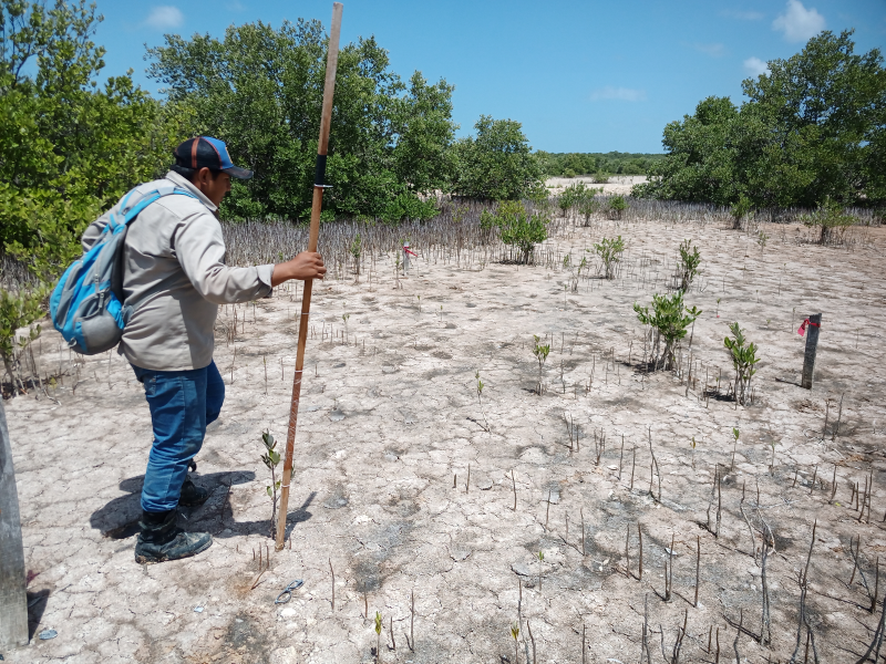 Fig. 36. Medición de variables biológicas en las plántulas de Rhizophora mangle reforestadas por siembra in situ en el borde de los canales excavados, en un sitio restaurado ubicado en la Reserva de la Biosfera los Petenes, Campeche.