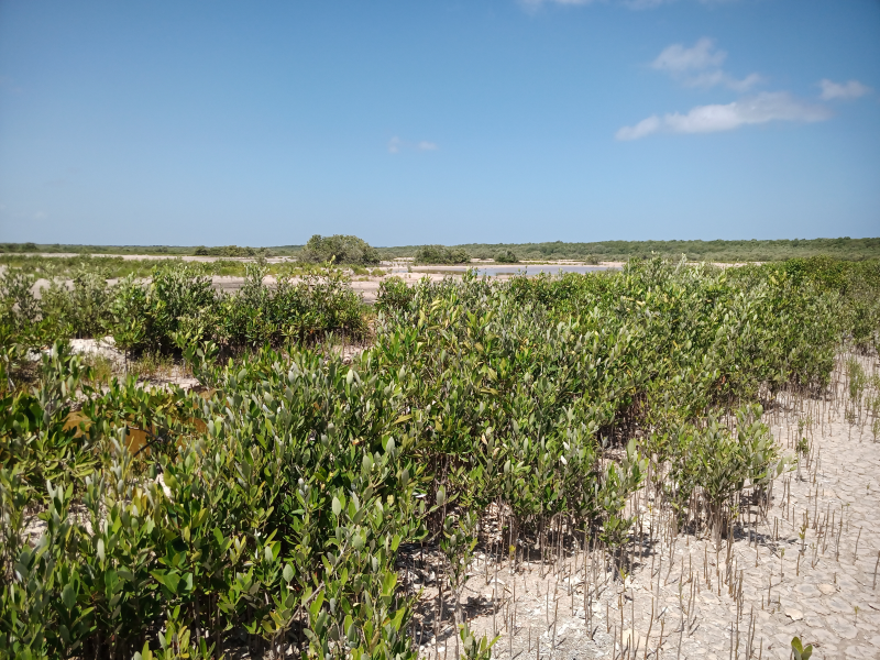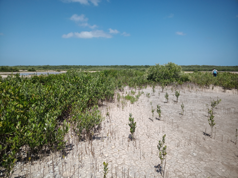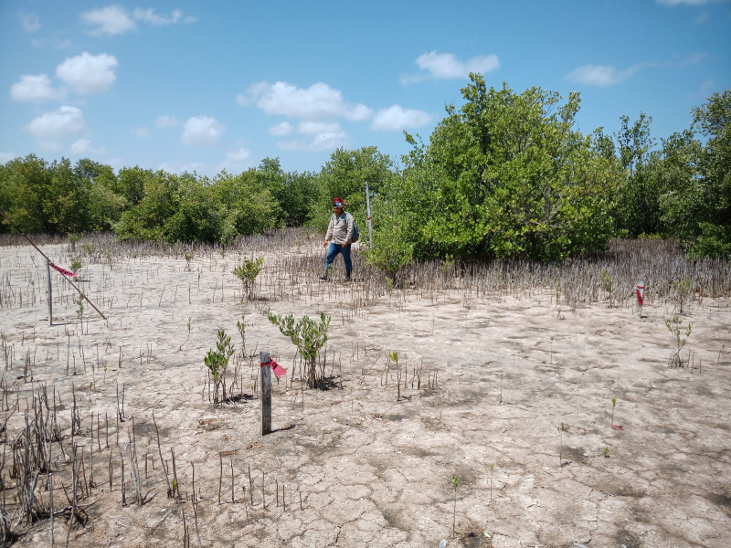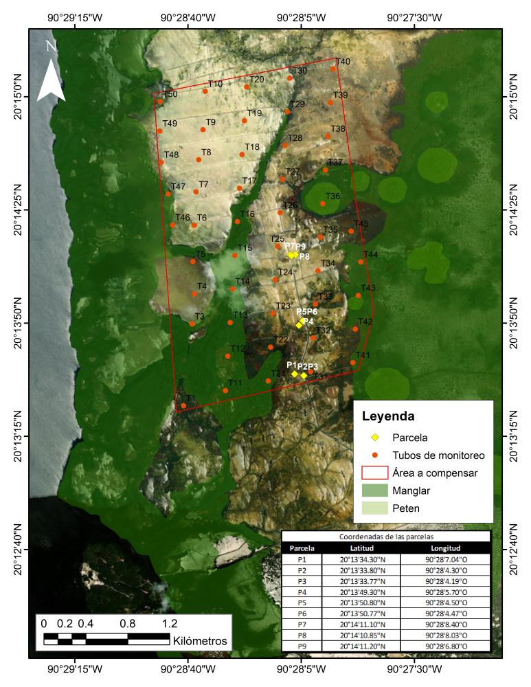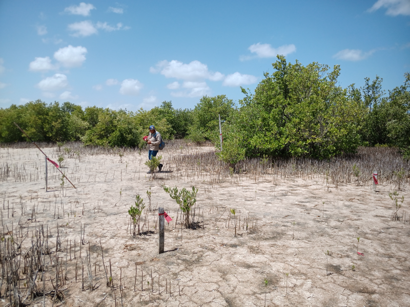 Fig. 34. Parcelas de monitoreo de variables biológicas en plántulas de Avicennia germinans reforestadas y por regeneración natural en un sitio restaurado, ubicado en la Reserva de la Biosfera los Petenes, Campeche.