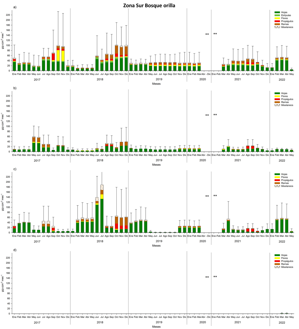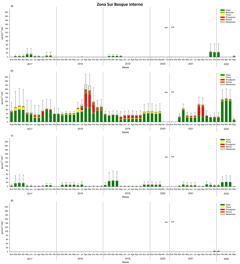 Los resultados establecen mayor producción de hojarasca en la zona sur, con respecto a la zona norte, comportamiento predecible por las características ambientales, ya mencionadas en la estructura forestal y parámetros fisicoquímicos del agua intersticial.